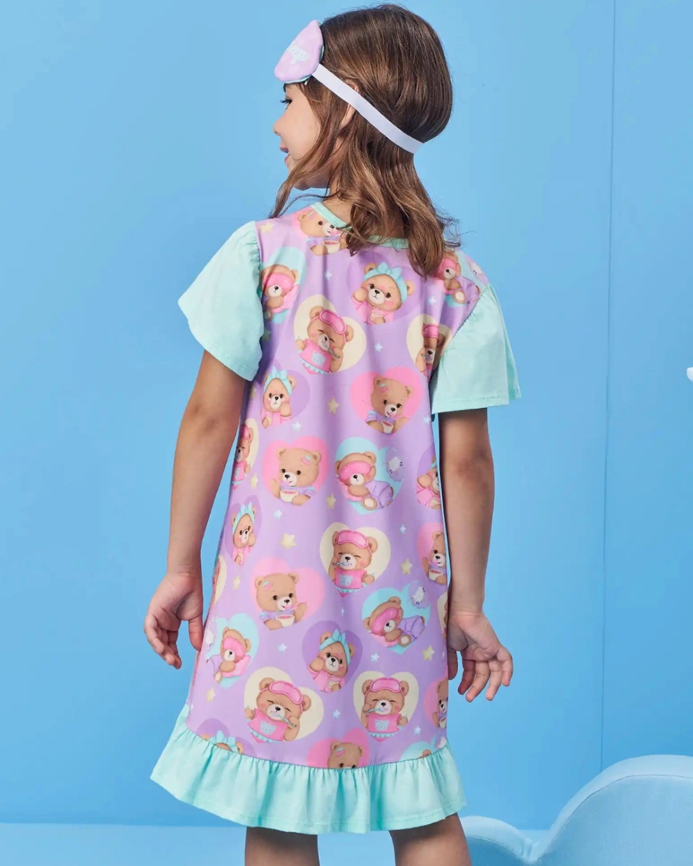 A Camisola Kukiê Ursinhas Infantil Feminina de Verão é perfeita para noites confortáveis e cheias de charme. Confeccionada em tecido macio e leve, ela traz estampa exclusiva de ursinhas em momento de leitura, transmitindo delicadeza e um toque lúdico. O modelo possui mangas curtas em verde água, gola redonda, barra com babado e predominância de rosa e lilás em um degradê encantador e acompanha máscara de dormir.